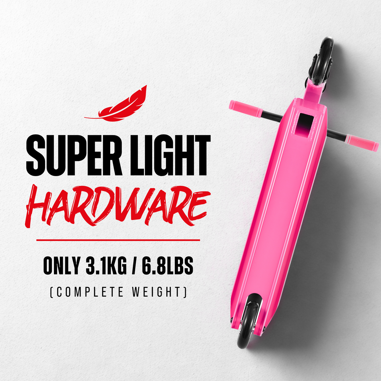 Le plateau est fabriqué à partir d'aluminium extrudé ultra léger selon notre profil unique et concave pour donner au cycliste cette sensation « pro ». Mesurant 4,5" de large x 18,5" de long, c'est la taille parfaite pour les jeunes cavaliers (5 à 10 ans). En plus d'avoir un design en forme de boîte avec des pattes intégrées, c'est la trottinette parfaite pour apprendre des tricks au skatepark.